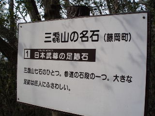 | 散策路と舗装路を交えてすすみます。途中にはサンシュユや早咲きの桜も咲いていました。桜の開花は全体的にはまだ先のようです。 しっかりした標識があり、それにしたがってみかも神社にむかいます(左写真の左側に登り口)。 途中には三毳山の名石と、いろいろ説明がありました。日本武尊の足跡石もその一つ。 |