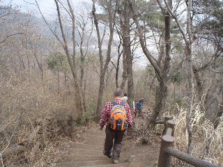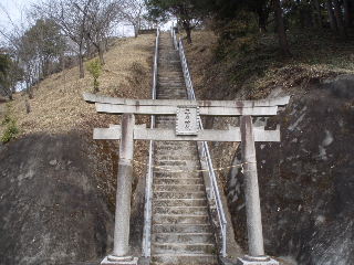 | 三毳神社の鳥居の先には石段が続きます。熱くなったのでここで上着を脱ぎました。 | |