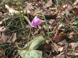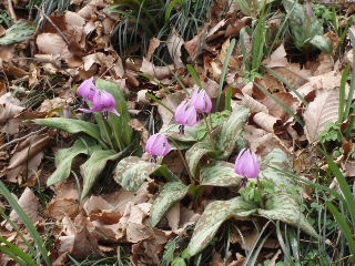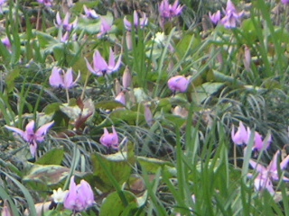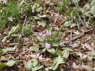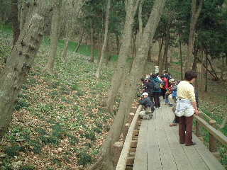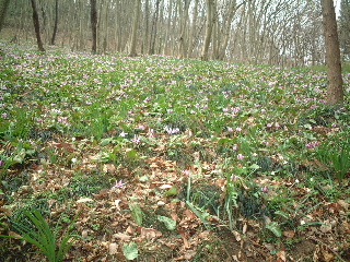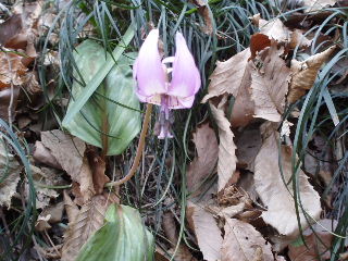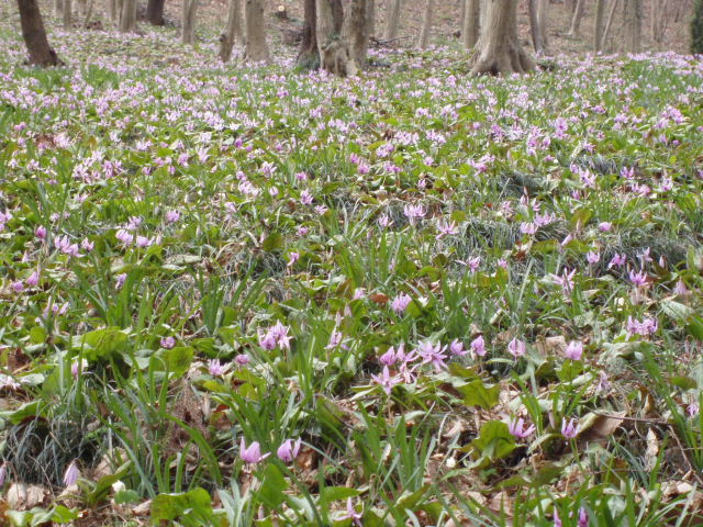 | カタクリはあちらこちらに散らばっているのですが、どうしても群生しているところに人が集まります。 保護のため散策道が設けられ柵があります。何故か今回近場に咲いている花は少なく、コンデジで写すには限界を感じる距離がありました。 |