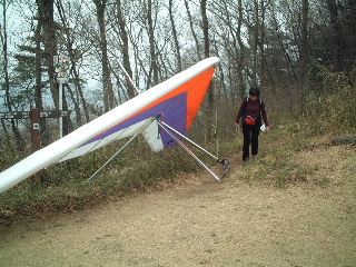 | ここはハングライダー、パラグライダーのフライトエリアになっています。帰りにココを通ったとき、丁度広げている人がいました(下の写真)。 | |