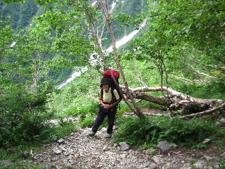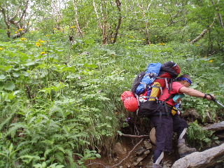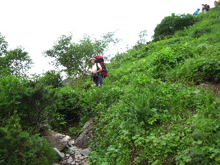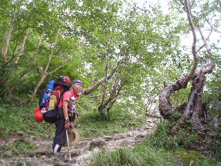 | 草スベリをある程度登ると気持ちの良いダケカンバの樹林帯。 トシちゃんが初めて北岳を登ったのは大学生の頃だそうな。登山ブームにのっかってテントを持ち、友達と二人で八本歯のコルの方から登ったそうですが、それから深くはまることなく趣味は乗って楽チンなオートバイへと向かっていきましたとさ(笑) そして今また若かりし頃やり残したことの再燃?(^o^) |