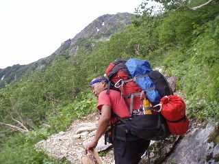 | ザックカバーを外し、使っていたデイパックを簡単に挟んで分岐を後にします。 う〜ん、デカザックに見えなくなっているような・・・たくましいぞワタシ(笑) |