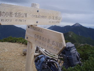 | 分岐で用意していると丁度小太郎山から戻ってくるご夫婦がいらしてびっくり。登っている人がいるんだねなんて話していたら、なんと昨日肩の小屋まで登ってテント泊し、北岳に登らず今回は小太郎山だけを登りに来られたとのこと。百高山を目指しているそうで、小太郎山の展望の素晴らしさを楽しそうに話していました。私たちと同年輩で共感することも多く、しばし歓談してからザックをデポし、身軽になって小太郎山へと向かいました。 | |