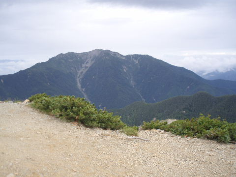 休みながら登って振りかえると鳳凰三山 鳳凰からも、この北岳が大きく見えるのです。 |