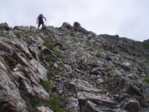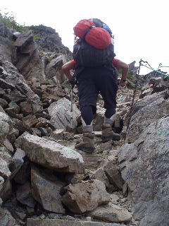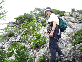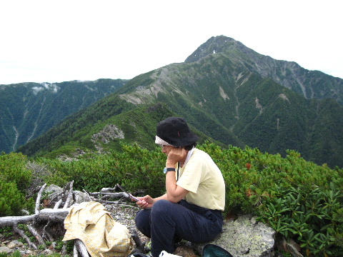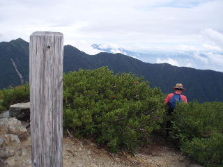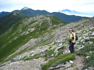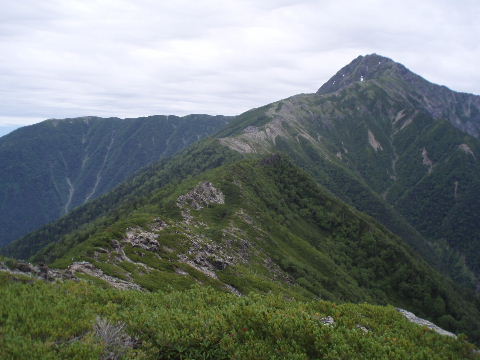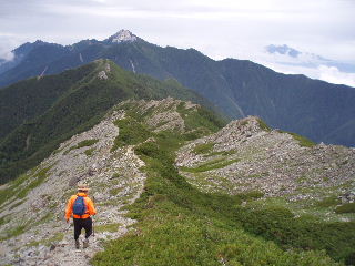 | 岩岩やらガレ場やらあり、まき道もありますが、稜線ですので概ね分かりやすいルートです。 途中、後から来たご夫婦に抜かれあっという間に姿が見えなくなりました。山頂でお話ししますが、今朝広河原を5時ごろ出発して小太郎山をピストンし、肩の小屋へテント泊なのだそうです。ヒョェ〜健脚ですね〜。私たちの二日分の行程です(@.@; 私たちが亀なだけですか?(笑) |