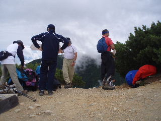 | 13時、肩の小屋に到着。ガスが湧きあがっていましたが今夜のテン場。ここまでくれば一安心。 | |