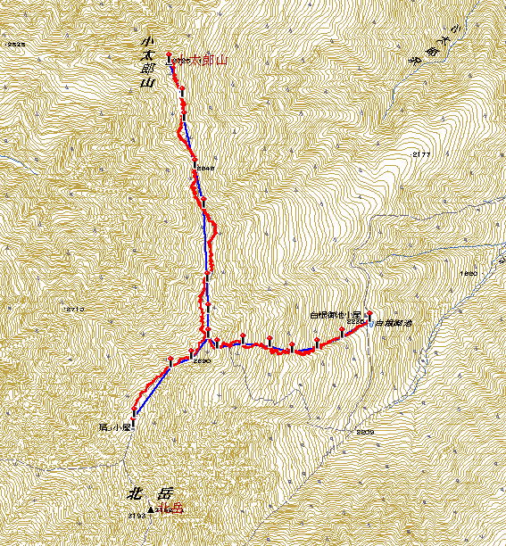 | 南ア縦走:二日目(五泊六日) 【全コース】小太郎山(こたろうやま 2725.1m)〜北岳(きただけ 3192.4m)〜間ノ岳(あいのだけ 3189.3m)〜西農鳥岳(にしのうとりだけ 3050m)〜農鳥岳(のうとりだけ 3025.9m)〜広河内岳(ひろごうちだけ 2895m)〜大籠岳(おおこもりだけ 2767.0m)〜白河内岳(しろごうちだけ 2813m)〜黒河内岳=笹山(くろごうちだけ=ささやま 2813m)〜白剥山(しらはぎやま 2237.2m)(クリック地図 =最高峰北岳。最北小太郎山より南下) |