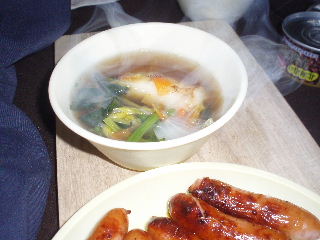 | そして朝。5時に起床。この日は鏡開きです。お汁粉(小豆缶)を持ってきたのですが、さすがに早朝から甘いものを食べる気になれずお雑煮♪&ウィンナー♪温まりました。 | |