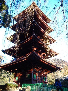 | 階段を登ったところでまず目に入るのが五重塔。今年(2009年)の5月に落慶式があるそうです。 この枝垂れ桜が有名ですからその時期に以前友人達と観光で来た事がありました。 |