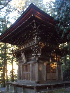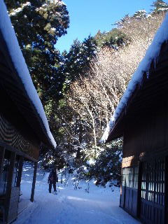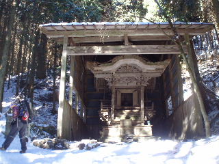 | 参道はしっかり除雪されていましたが、人が歩かない斜面には雪が残っています。上を見上げると二頭の鹿(ホンシュウジカ)が歩いてました。白いお尻がとってもキュート! ニホンカモシカも生息しているそうですが、残念ながらバッタリ出来ず。ブッポウソウも飛んでくるようですが、夏鳥ですから今の時期はいないのでしょう。本当にブッポウソウと鳴くのか聞いてみたい気がしますが実際には違うそうですね⇒コチラ |