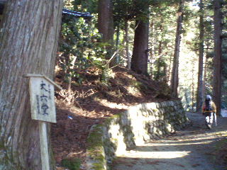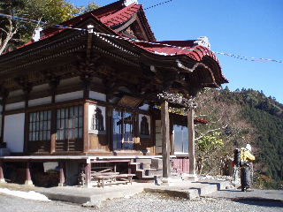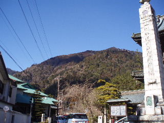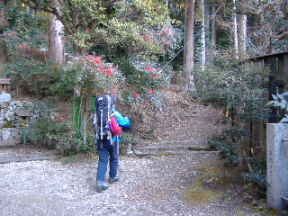 | 久遠寺本堂の左手から登山道へ。ロープウェイへは左斜面を下り、トレッキングは右へ。 | |