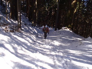 | 大光坊をすぎると除雪はされていませんでした。前日はふかふか雪だったと思いますが、かなり人が入ったようです。 行儀の良い杉林が続きます。気温は9時10分、1度。 |