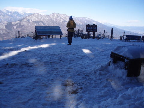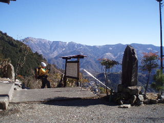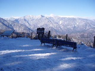 北西の少し下ったところに展望台。 丁度日陰で寒かったのですが、ぐるりといい眺め♪ 山梨百名山の山頂標柱もそばに。 |