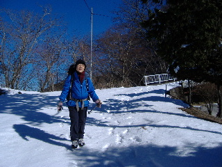 | 檜もあったようですが杉などの針葉樹が多い中、こうした風景も。きれいな青空が終日広がって気持ちのいい一日でした。 足元は歩かれた跡が凍ってます。でも両脇がサクサクなので最後までアイゼンは使わず。ストックが心強い味方でした。 |