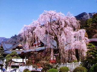 | 境内の大きな枝垂桜の木。そして境内から身延山山頂。 観光で来た時はここまででしたが今回はあの山頂目指して歩きます。 枝垂桜が満開になると下の写真のようになります。 |
