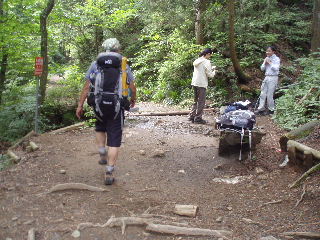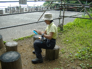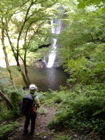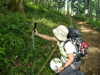 | 下りるほどに暑くなってきました。大滝の分岐でトシちゃん滝まで下りる気が失せています。ここから滝は見えないので、かなり下るのではないかと嫌がっている様子がありあり・・・^_^; 「滝の側は涼しいよ〜。此処は滝が魅力なんだから〜」と先に下りて行こうとすると男性が一人登り返してきました。「下までどのくらいかかりました?」と聞くと「すぐですよ、そこですよ」という返事。「ですよね〜♪」 |