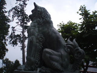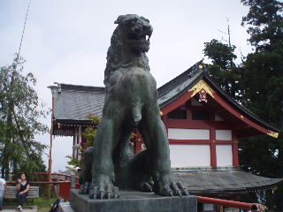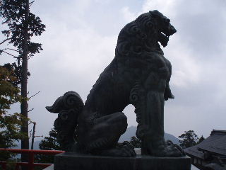 御岳神社、ここでもお参りして 階段を下りようとすると・・・ ん?両脇には立派な狛犬さん |