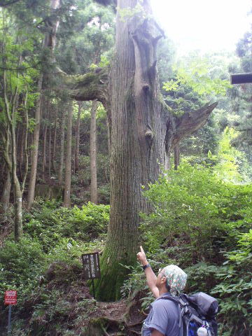 トシちゃんと合流し大岳山へ向かいますが 途中に天狗が腰掛けすぎて曲がった杉の木 いやいや、そうではなくて天狗の腰掛杉です^_^; |