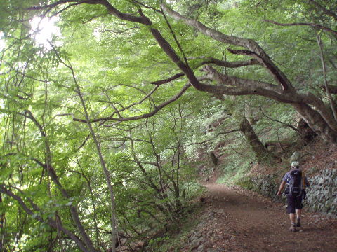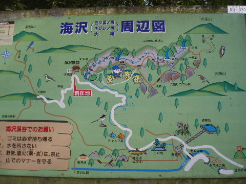 | 山頂でゆっくり休んでから反対方向へ。海沢(うなざわ)探勝路へと下りることにします。 sanaeは以前ここを逆コースで歩いています。9月でしたが、御岳のレンゲショウマがまだ咲き残っていて感激したのでした。数が多いので開花時期が長いのかもしれません(記録はコチラ)。丁度見頃なのはやはり8月の中頃なのでしょう。その頃は遠出してしまうのでいつも見逃しています。 |