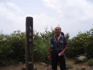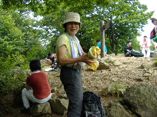 休んだ後の登りはきついと喘ぎながらも山頂到着。 富士山はやはり見えませんが、「はい、スマ〜イル」 ようやく笑顔です・・・ってヤラセ(^^ゞ。 |