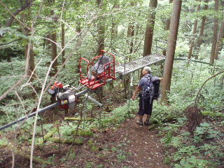| 途中にあるこの人工物は?何かを運ぶものらしい・・・ 山葵田が左手にあったようですが、既に荒れて、キツリフネが咲いていました。 |