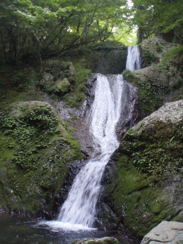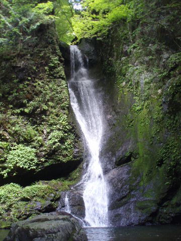 | そのまま下っていくと三ツ釜の滝。 これは前回見落としていました。 改めて、眺めてビックリ! きれいでした。 上段の釜では若い人が飛び込んで気持ち良さそうでした。 あの高さを飛び込むなんて、私は思っただけで涼しくなります^_^; 写真では収まりきれないので動画でどうぞ♪ |