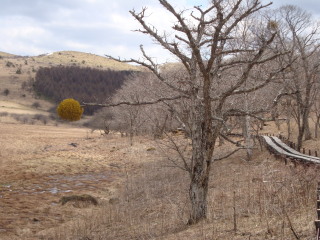 | 美ヶ原方面 眼下の白い木に目が行きました。 山頂は風が強いので あそこまで行ってみようとトシちゃん。 ![]() |