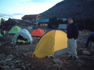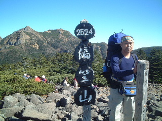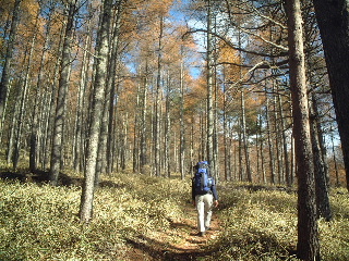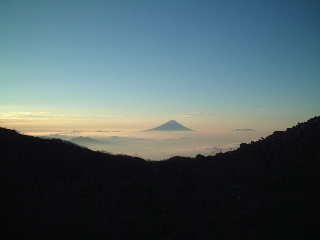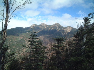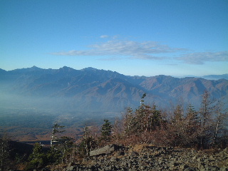 間もなくやってきた早足の学生と後からゆっくり続く学生の間に入って、見慣れた八ヶ岳の山並みを眺めながら、気をつけて岩稜帯をいった。雪の時期はちょっと怖そうだ。ピークを捲きながらものろし場に寄り、もう一度ぐるりと風景を眺めてから一気に青年小屋(テン場)へと向かった。 テン場には既にいくつか設営してあった。テン場代は一人500円。水場は西岳方面に4,5分行くとあり、乙女の水と書かれている。水量は充分。西岳と編笠山は翌日行くことにして、テント設営後、早めに夕食。6時にはシュラフに潜り込んだ。夫は早くも眠りかけていたが、私は記録のメモをつけ始めた。この時、隣から聞き覚えのある固有名詞が聞こえてきて、一瞬耳を傾けた。すると呼ぶ名前にも覚えがあり、それは知っている人たちだと確信。起きあがってテントから顔を出したが既に周囲は暗く、顔がはっきり見えない。その隣のテントは私達が到着したとき既に設営されており、靴の大きさから男性二人だと分かっていた。ちょっと躊躇ったが声をかけるとやはり思った通りのお二人だった。互いにびっくり。夫とテントにお邪魔し、久しぶりに歓談。それにしても、こんなこともあるのだと、いまだに驚いている。 二日目(11/2) 翌朝はのんびり起床。軽く朝食を済ませ、隣のテントの知り合いと挨拶をしてからナップザック一つで西岳へ向かった。この源治新道も他に歩く人がなく静かで気持ちよかった。緩やかなアップダウンを越えて山頂に立つと、南アルプスが大きく正面に見える。編笠山の右脇に富士山、南アルプスの右後方に中央アルプス・御嶽山・乗鞍・北アルプスときれいに見えていた。槍の穂先もしっかり見えて、二人だけではもったいないような静かな山頂だった。この時、それぞれの山頂から同じ感動を味わっている人が沢山いたことだろう。