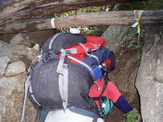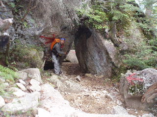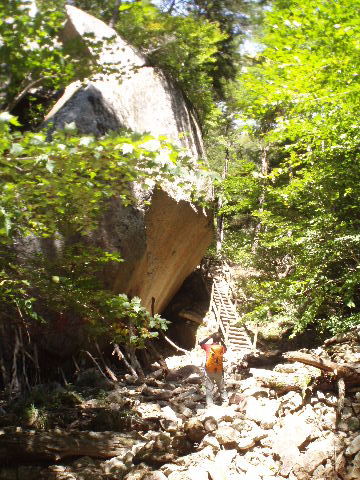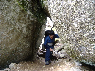 | くぐる場所は体勢がちょっときついです^_^; 高低差のある所も参ります。トシちゃんの通った所でなく、石の上に乗って段差をクリアしようとしたら、やや斜めっていた石の上を滑って、こけると同時にそのやや大きな石をひっくり返してしまいました(どんなこけ方?^_^;)。ケガはしませんでしたがその石を元に戻そうとしても戻りません。それほど重かった石を足でサッカーボールを転がすかのように軽やかに?ひっくり返してしまったワタシって・・・(汗; |