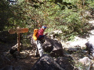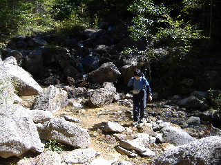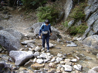 | その涼やかな水音を聞きながら石のうえをトントン・・・と。今度は転びません(笑) きれいな水流です。このあたりも紅葉はきれいですが、まだ青々していました。 | ||||
