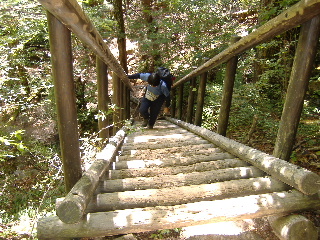 | さすが人気の山だけあって、足元の太い丸太もかなり磨耗してました。乗ったらバキッて折れそうで恐怖でした。それこそ私のプライドが傷つけられそうで・・・あっ丸太を傷つけちゃいけないと思いまして^_^; | ||||