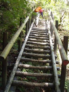 | 手すりに掴まろうとするのですが太すぎて、しかも皆さんが頼っている手すりですからツルツルに見事に磨きこまれています。、滑ったら意味をなさないような・・・ 子供達にかじられたトシちゃんの足の脛のようなハシゴ段・・・。一方手すりはsanaeの二の腕、二の足(ヘンな言い方!^_^;)か・・・失礼なって丸太に怒られる?汗; |