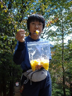 | 山頂まで見晴らしはよくありませんが、短いですし岩などあって飽きのこないコースです。 そのまま休まずに登れてしまいそうでしたがチョット一休み。凍らせたパインが程よく溶けてウマ〜ッ! |