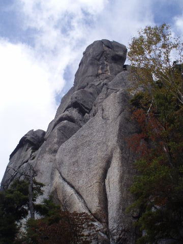 | 下で見上げたヤスリ岩。山頂から見下ろしますが、五丈岩が金峰山のシンボルならば、これは瑞牆山のシンボルですね。以前岩トレをしている姿を見たことがありますが、この日はこの山頂南面をロープワークしている人を見かけました。覗き込むと絶壁、足が竦みます。 | ||||