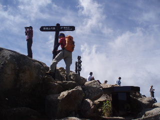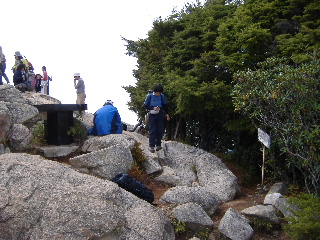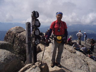 | 岩だらけの山頂はひとが入れ替わり賑わっていました。私たちは金峰山の見える静かな場所で1時間以上ものんびり。トシちゃんは殆ど寝てましたが・・^_^; 再び山頂の展望を見に行きましたが遠望はガス。下山することにします。 |