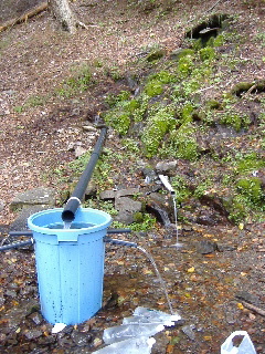 | テント場を申し込んでいる間にトシちゃんは水場へ。此処の水は豊富です。山肌からあふれ出る水。夏は冷たく冬はあたたかい、まるで井戸水のよう。水の流れ出るところから直接汲めば落ち葉もなく美味しくいただけます。 | ||||