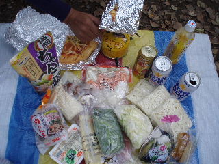 | 夕食にはまだ早いのでピザを温めておやつタイム♪ 今夜は外で食べようと食材を出して並べますが、ちゃんこ鍋3人前^_^; 食べきれるかな・・・・(翌日の朝と、金峰山から戻ってから食べてようやく片付きました。^_^;) |