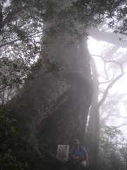 登る間、雨に濡れた樹林帯は清々しかった。見通しの良いルートではないので靄っていても格別気にはならない。それどころか適当に水場があり嬉しい。せせらぎの音、野鳥のさえずりが耳に涼やかに響き心地よい。途中万代杉があり、改めてその大きさを見る。モッチョム太郎杉は気づかず通過。 後方の四人の若者はいつしか離れ、かわって大人数のパーティがやってきた。宮之浦岳の予定だった彼らは二日間、通行止めで淀川に行けず、それでこの日はこのモッチョム岳にしたそうだ。一方、若者四人は雨になりそうなので下山したという。彼らは広島のハイキングの会で総勢18名。年齢層は幅があったようだが、全員足並みが揃って素晴らしい。しかし18名の後となると厳しいのでそのまま先行する。 |