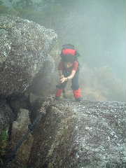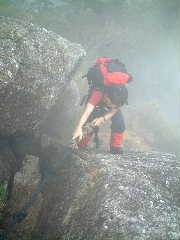 朝起きると雨は止んでいた。ヨシッ!足元が濡れないように下だけ合羽をはいて出発。たまたま若い四人組と一緒になり、前後していく。彼らは縄文杉へ行く予定だったらしいが、昨日に引き続きヤクスギランドへの道路が通行止めだったらしい。 千尋滝へ行く途中に登山口があり登っていくと、途中から千尋滝が見えた。 途中の渡渉はロープが張られており、前日の雨量にも関わらず水量はすでに少なく問題はなかった。昨日のような雨が降ったらここも渡るのは容易ではないだろう。 |