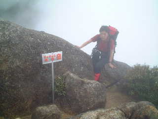 最初の急登から緩やかになり、そろそろ山頂かと思ったら下りに転じる。えっ?まだ?と思い、改めて地図を見ると、なるほど100メートルくらい下ってから登り返している。目指す山頂は最高点より30メートルほど低い。徐々に下り、登り返して目をこらすが前方はガスの中で分からない。ロープ付きの急な下りと登り、そしてその先を見るとガスの中に高度感溢れる尖った山容が目に飛び込んできた。一瞬たじろぐ。 最後の登りと思ったところを登りきる時、思いがけなくヒカゲツツジと思われる花が咲いていた。思わずほっと笑顔になるが、その先にまたも垂れ下がる太いロープを見て顔が引きつった。同時に笑ってしまった。山頂直下の最後のクライミング、しっかり握り、必死にがんばって登る。 |