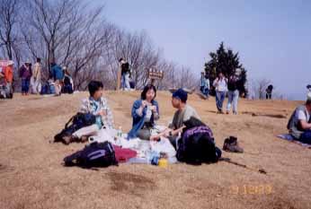 尾根に出るとホッとする。もう一頑張りで山頂だ。山頂には桜の木が数本あるがもちろん花はまだ咲いていない。大きく見える筈の富士山は春霞で見えずこれも残念。座ってゆっくり休んでいると、始めこそ暑かったが涼風にそのうち寒くなってきた。
