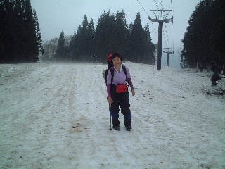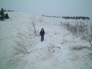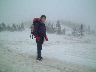 そこへ上から声が聞こえ、スキー(テレマーク?)で下りてくる人がいた。すれ違いに挨拶。若い男女二人連れ。登りで見かけた人だった。森吉山まで行く予定だったが、ゴンドラ山頂駅まで行ったらガスと強風のため、怖いから戻ってきたと言う。