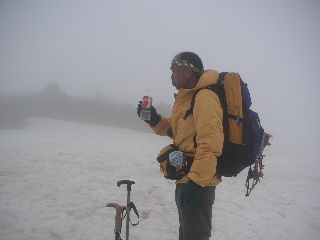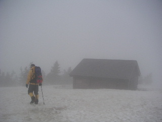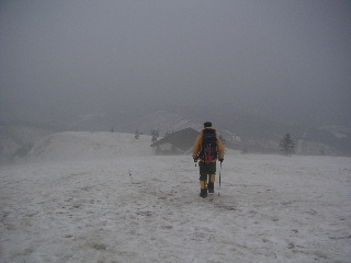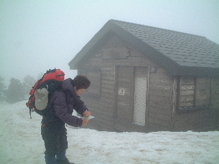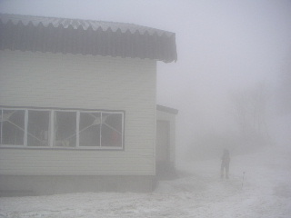 風はそれほど強くは無かったが、建物の陰へ。ペンションで貰ったパンと温かい飲み物を飲んで一先ず休憩。ゆっくり休んでいる内にガスが晴れなかったらここから下山しようと思っていた。