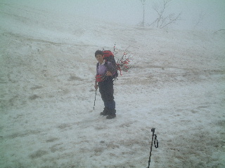 そうして行くと、有り難いことに、道筋のほぼ等間隔に竹ざおが立っていた。しかし次の竹ざおがガスで見えないので中間にもこうして枝をさしていった。