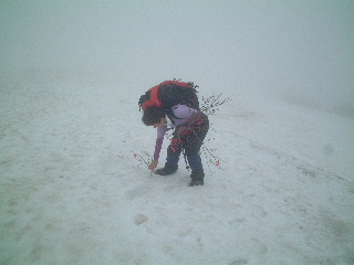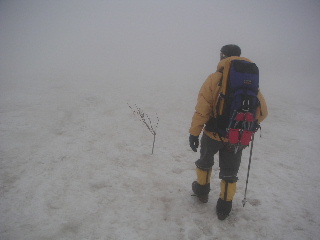 無事に下りるための、このテープ付きの小枝がとても役立った。視界は数メートルだったが、見える位置に竹ざおやこの小枝があり、安心感があった。 |