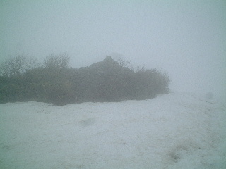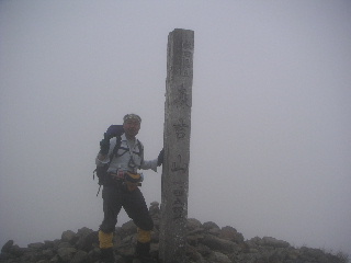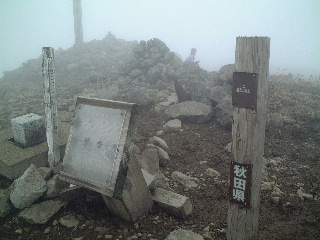 山頂はガスっていて、もちろん誰もいない。阿仁スキー場やペンションからは携帯が通じなかったが、この山頂からは通じた。