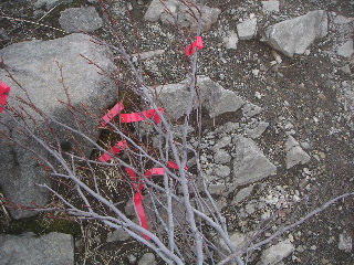 頼りは赤テープをつけたこの木切れ(全て落ちていた枝。生木を折っていないので念のため)。
