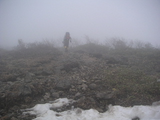 待つ間、戴いた地形図と磁石で方角を確かめ、地形を眺めていると、晴れていれば山頂は近いし、難しくないコースなのにナァ・・・と思える。ただ、緩やかに広がっている箇所があるだけに、ガスっていると難度が一気に上がる。あとは等高線のつんだ右側に寄り過ぎなければ大丈夫だろう。