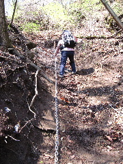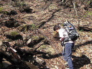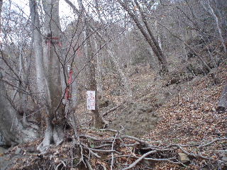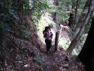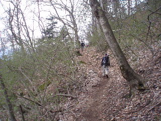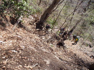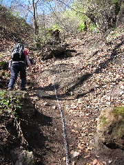| ところが上に行くほどに傾斜がきつくなり、湿った土と岩で滑りやすくなりました。 |