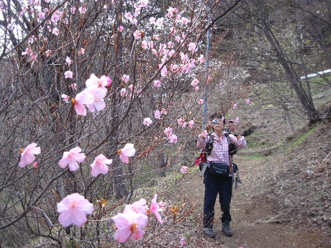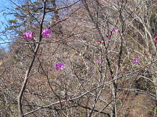目の前のツツジはアカヤシオかと思いましたがミツバツツジでしょうか。しばし気持ちを落ち着かせて眺めていました。その間にも登ってくる人がいます。 |